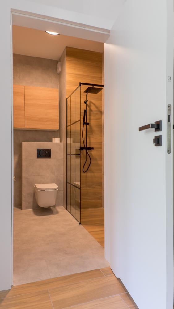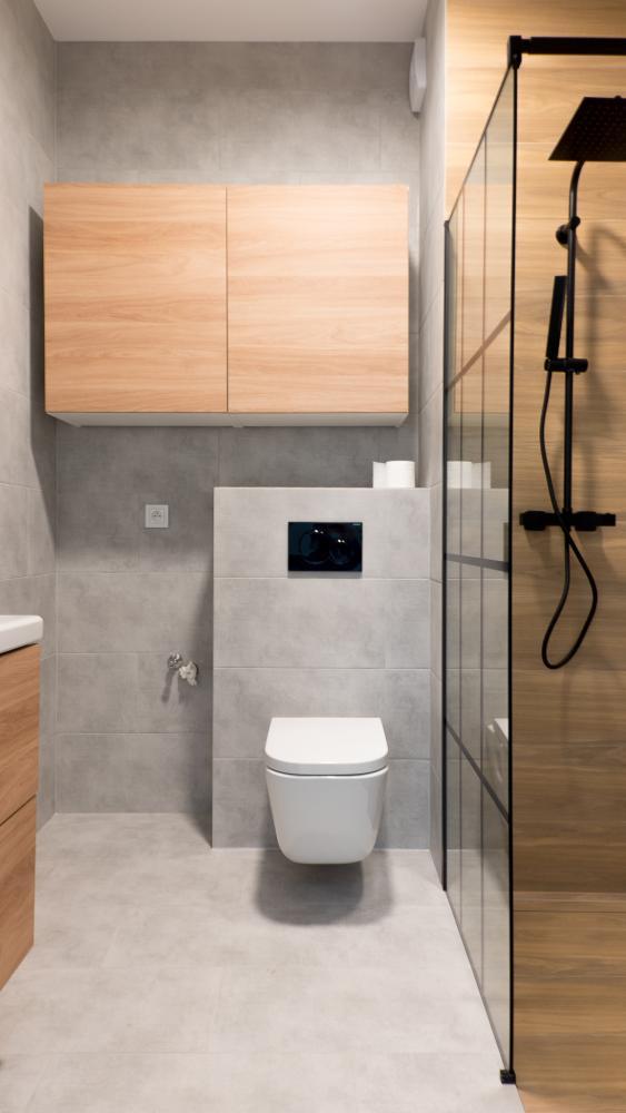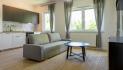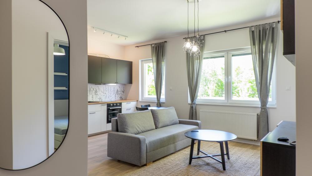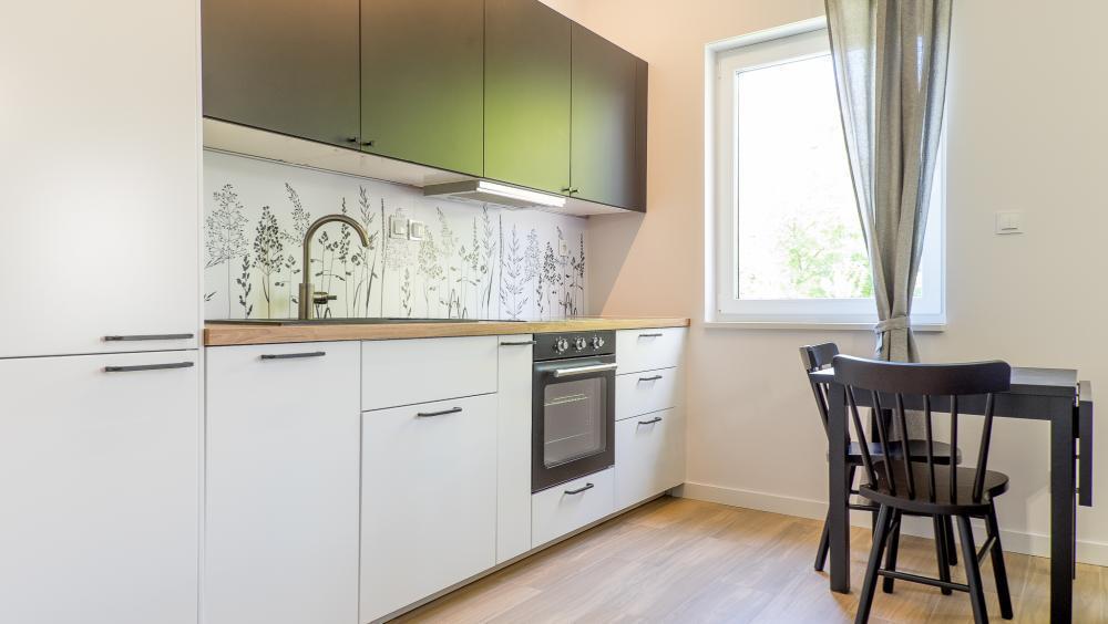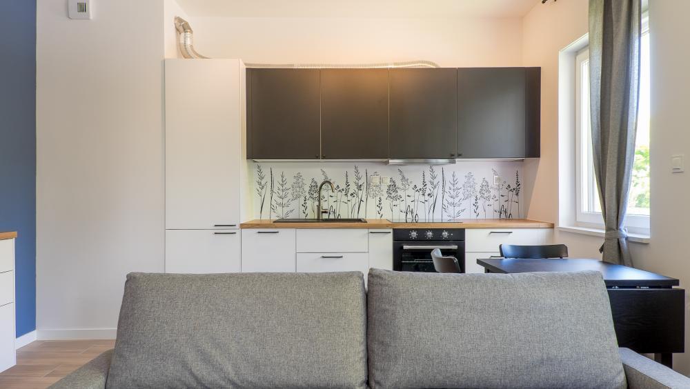 - Aneks kuchenny w pełni wyposażony: lodówko-zamrażarka, płyta indukcyjna, zmywarka, piekarnik, zabudowa w wysokim standardzie