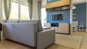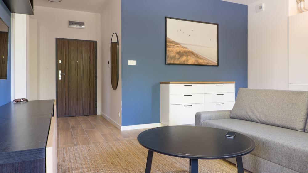 Mieszkanie wyposażone jest we wszystkie niezbędne sprzęty i meble, w tym rozkładaną kanapę, telewizor i stół jadalniany.